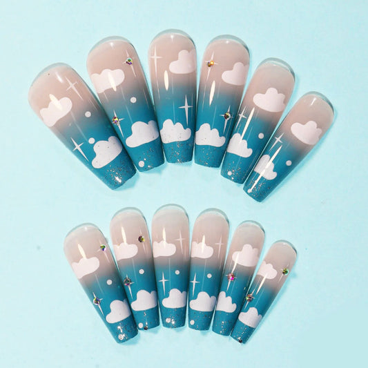 Glossy Blue Sky Clouds Long Ballet Press-on Nails