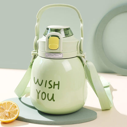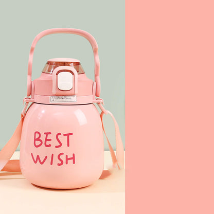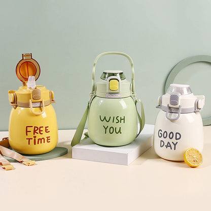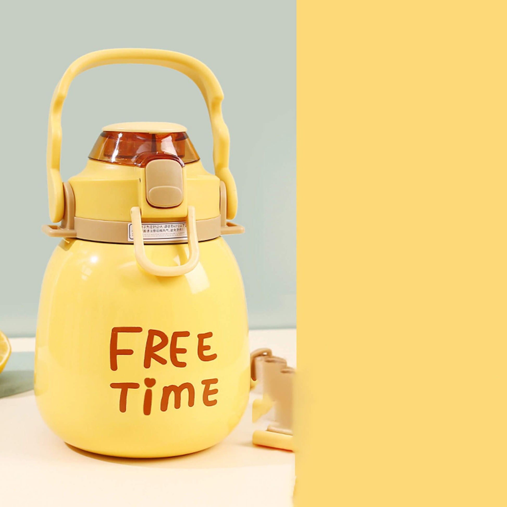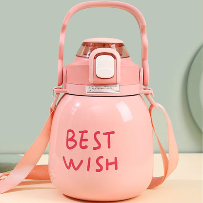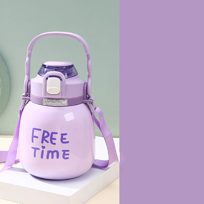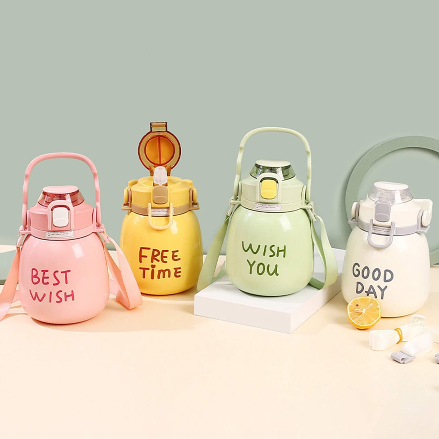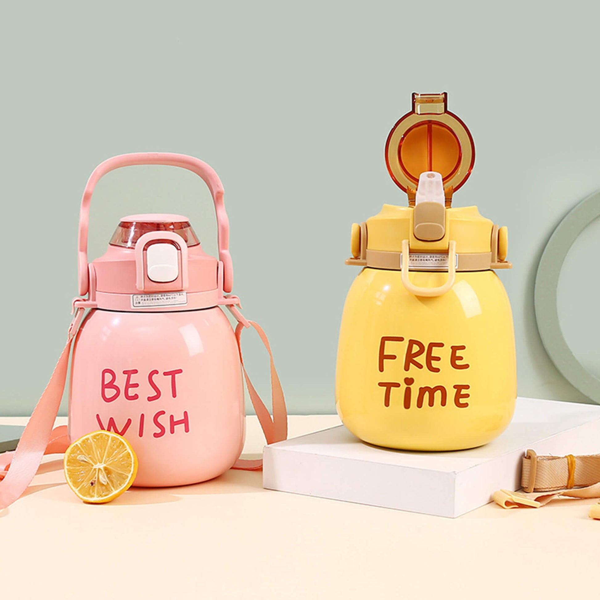 Stylish, durable and easy to clean, our kid back-to-school water bottle comes with a handle and strap silicone pacifier, sure to raise your child's interest in drinking water. Its carrying handle and strap make it easy to carry and its cartoon design adds fun to hydration.