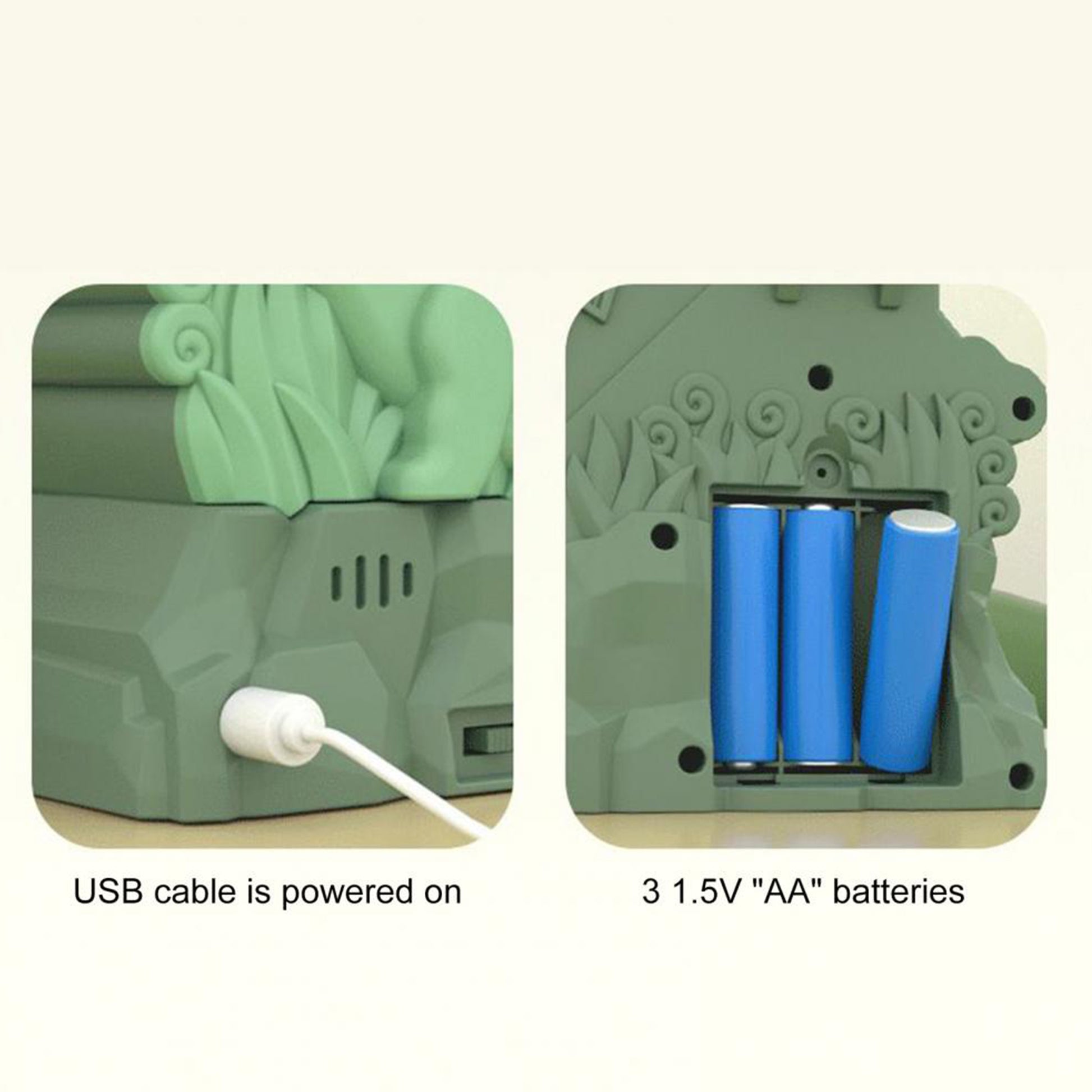 The package includes a DIY assembly climbing ladder, 5 mini dinosaurs, and a USB charging cable. The toy can be powered by USB charging (cable included) or 3 x AA batteries (not included).