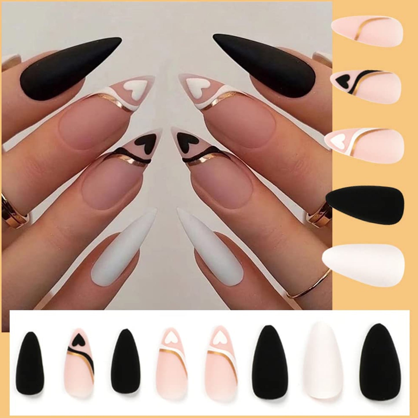 Craft a Captivating Look: Create a stunning nail look by combining a heart design with black and white French tips and gold lines. The matte finish gives your nails an exquisite, modern touch.