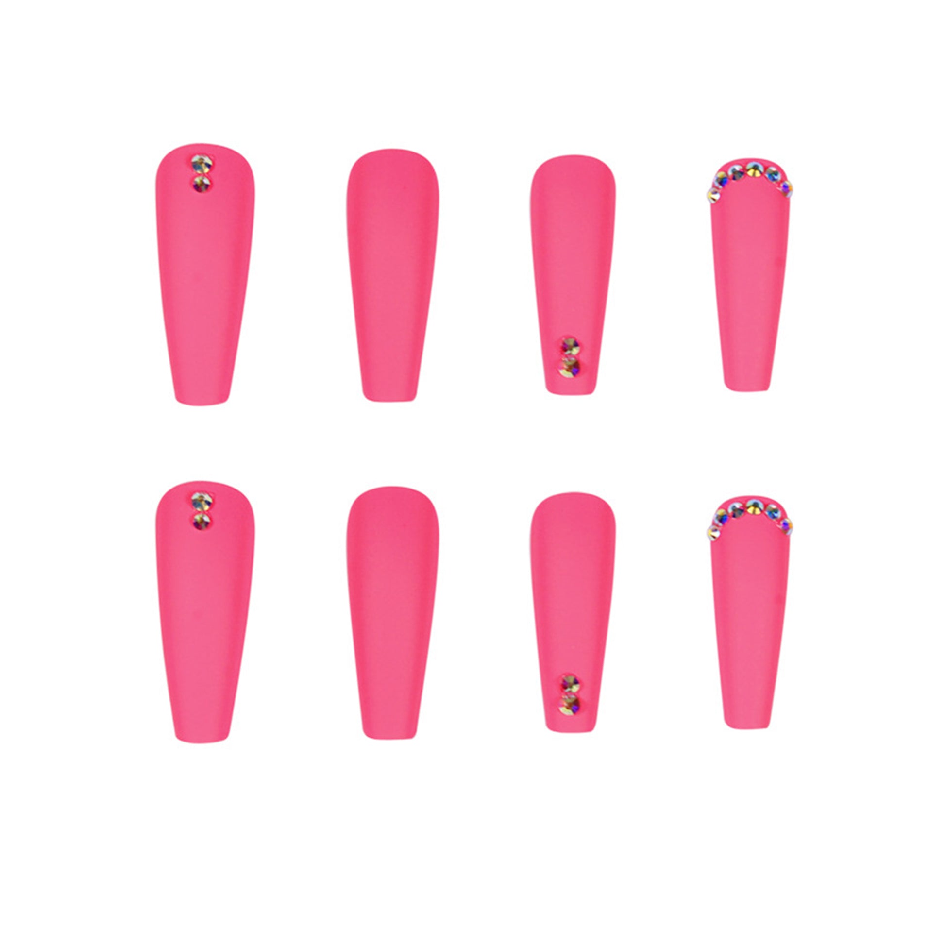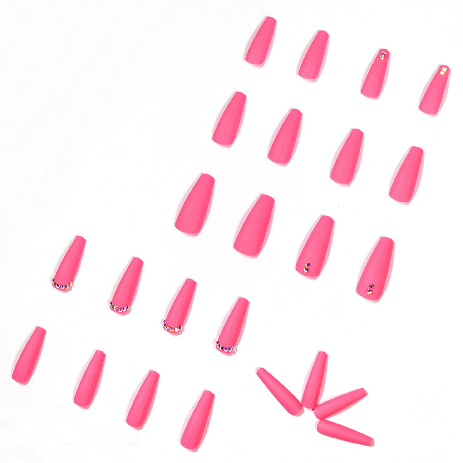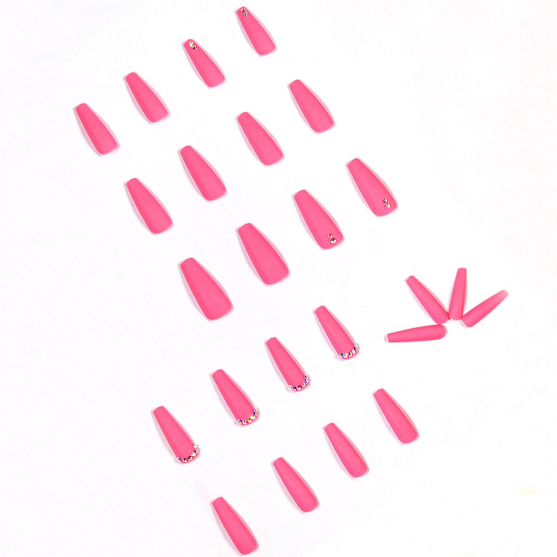These 24 hardened nails offer sophistication with their long ballerina shape and full rhinestone glitter, and modernity through their matte finish. Coffin shape and fraux nail decoration add an edgy twist for an eye-catching look. The rosy pink hue adds feminine flair, making these nails the perfect daring statement. Dive into luxury and grace today! 💅